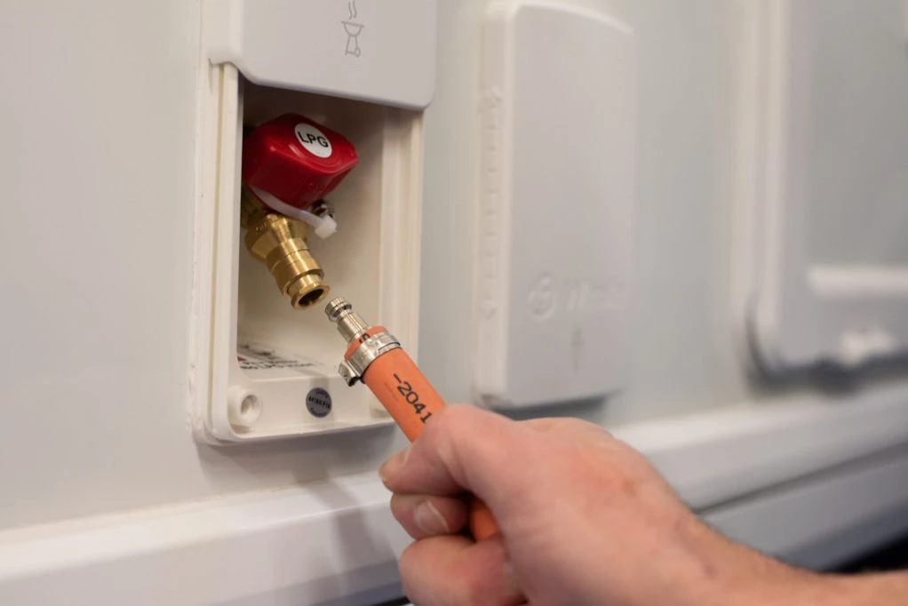 Quick and easy (un)coupling to an external hook-up on a caravan or motorhome.