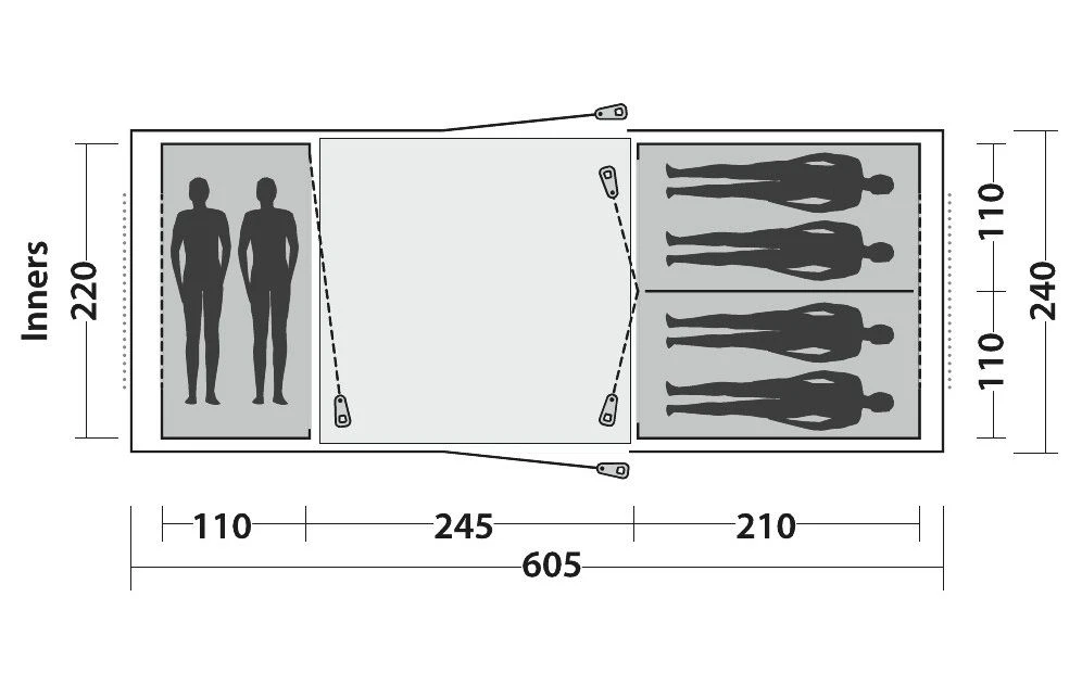 With twin facing doors, the large, light-filled living area, with full standing headroom, is easily accessed for happy group campsite living.