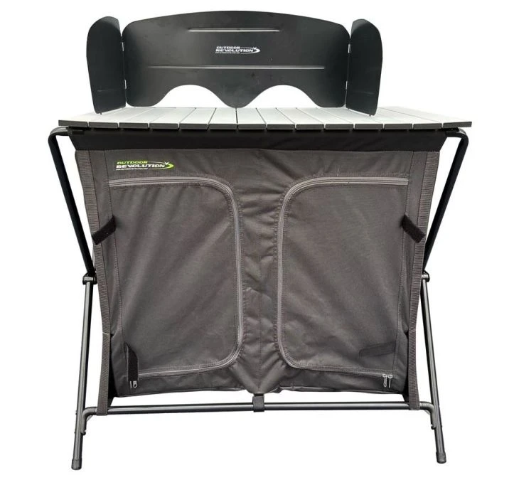 The Outdoor Revolution Monza Camp Kitchen is a dual-purpose aluminium top cooker stand with removable windshield and separate twin storage cupboards, featuring 2 level shelving with rigid shelf inserts and zip back doors.